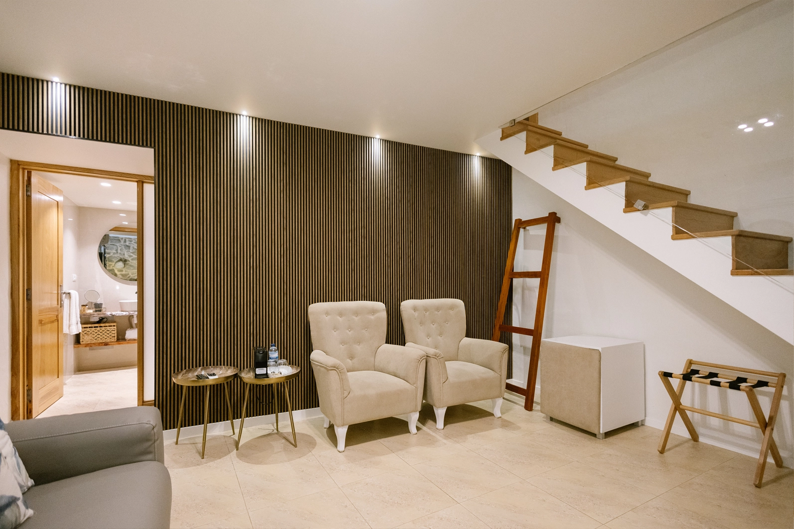 The ground floor consists of a living room with a sofa bed, and comes equipped with two armchairs, LCD TV, mini bar, coffee maker, bathroom with shower, hairdryer and toiletries. The 1st floor consists of a wooden-floored bedroom equipped with double bed, wardrobe, LCD TV, mini bar, coffee maker and with air conditioning on both floors.